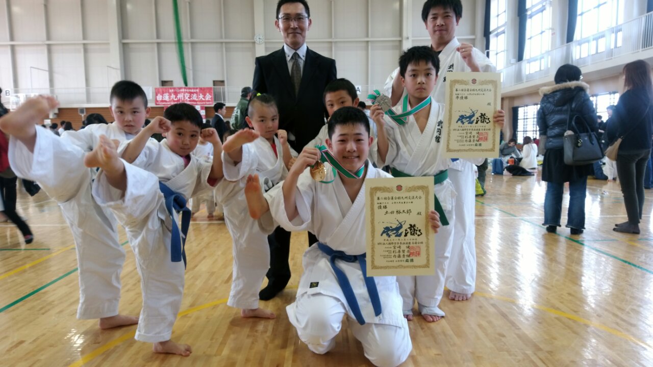 白蓮会館九州交流試合 2019-02-27 Tweet 2019.2.24 白蓮会館九州交流試合に参加しました。 武円館からは7名エントリー。 入賞者 小学6年初級の部 優勝 土田裕太郎くん 小学5年初級の部 準優勝 糸山 大智くん おめでとうございました。